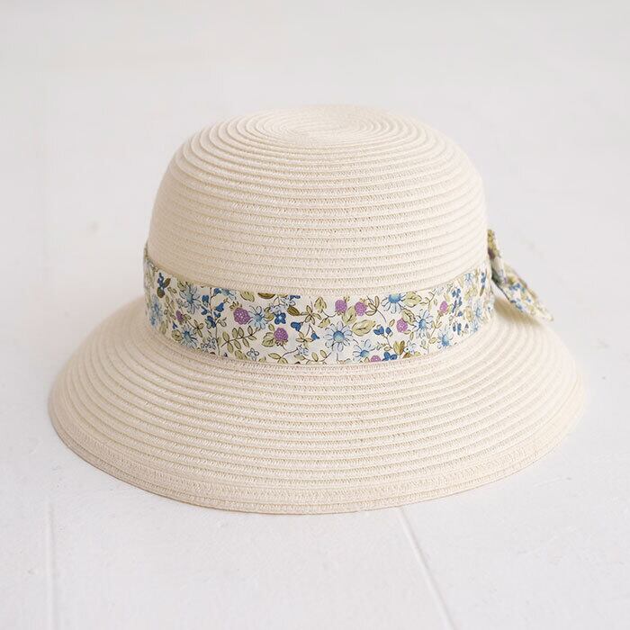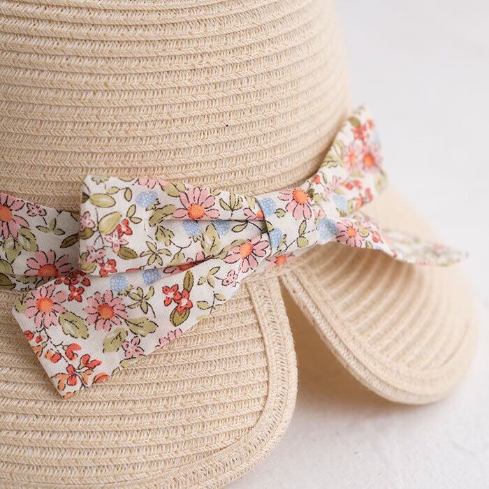小花柄の生地リボンが後ろについた畳める仕様のハット。