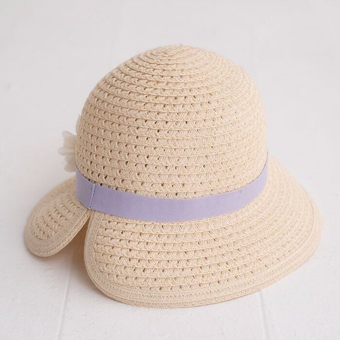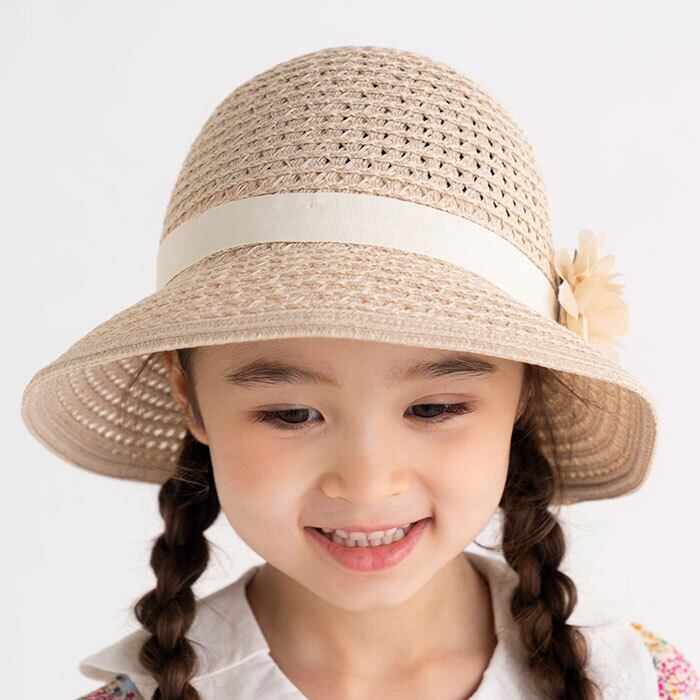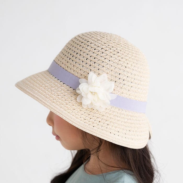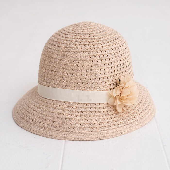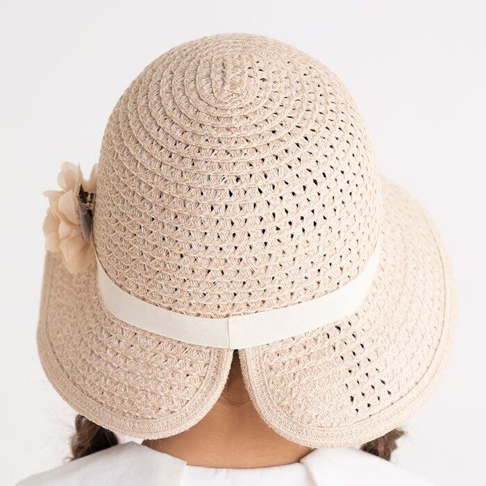 可愛いお花のコサージュがついたハット。畳んでも型崩れせず、嵩張らないので旅行やイベント時に重宝します。洗うときはコサージュを取り外して手洗いができます。