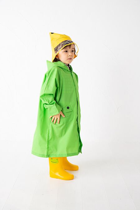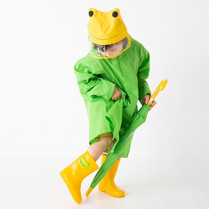 同じカエルモチーフのレインコート、傘、レインハットもあります。コーディネートすれば雨の日がもっと楽しくなるかも?