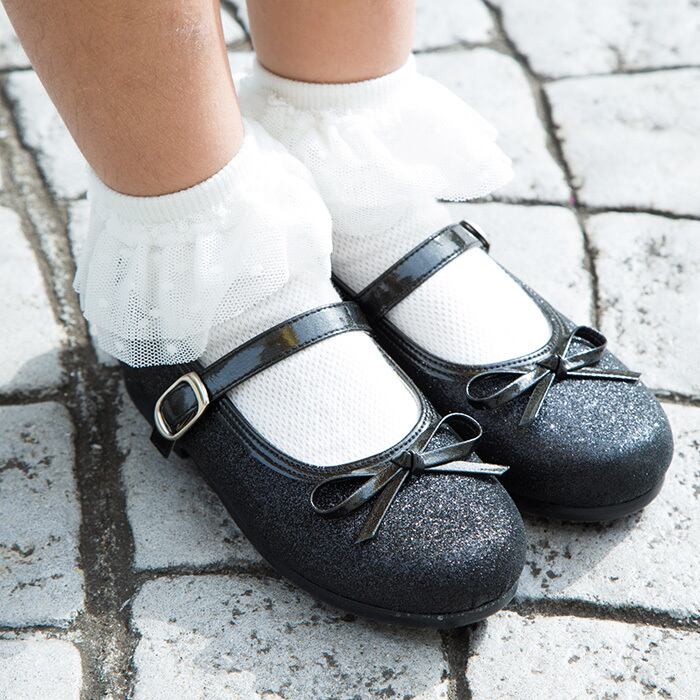 丸みを帯びたシルエットと甲に付いたリボンが女の子らしさを際立たせます。