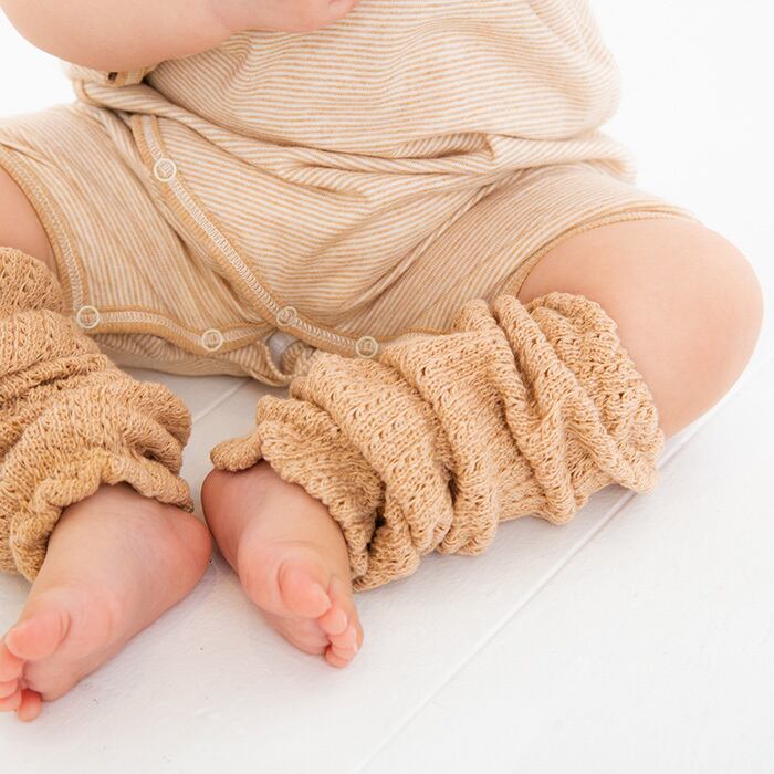 ローゲージでふんわりと編んだ、さわやかでやさしいベビーから使えるレッグウォーマー。冬は防寒、夏は冷房・紫外線対策に(ブラウンは天然UV効果大!)。おむつ替えも楽々です。