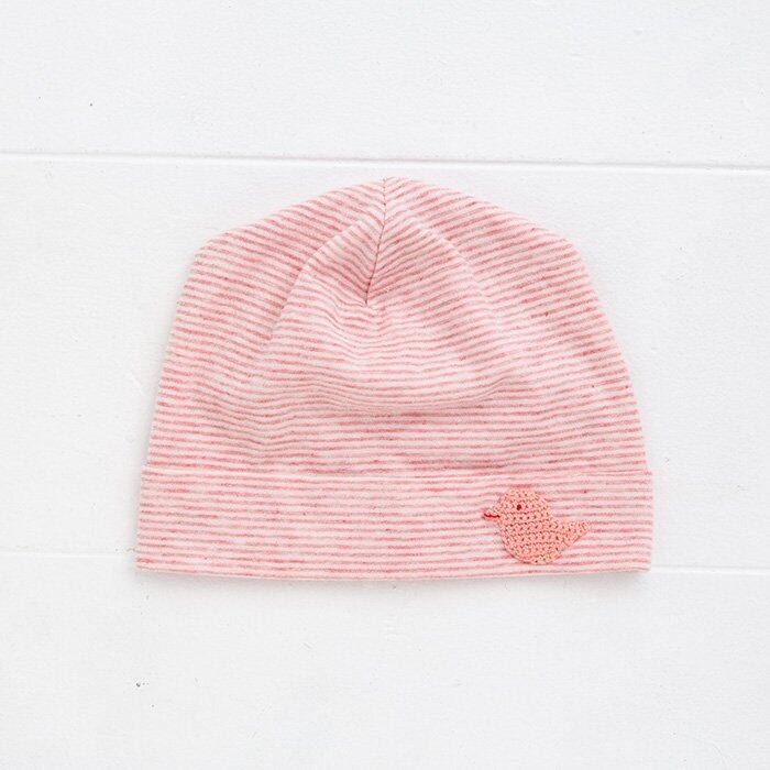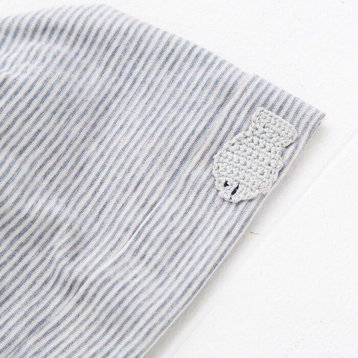 オーガニックコットンの天竺という薄手の素材でつくりました。2枚合わせにして縫い代が内側に出ないようにしていますので、頭当たりがやさしくなっています。かぶせやすいよう、後ろにタックを寄せています。手編みのモチーフ付。
