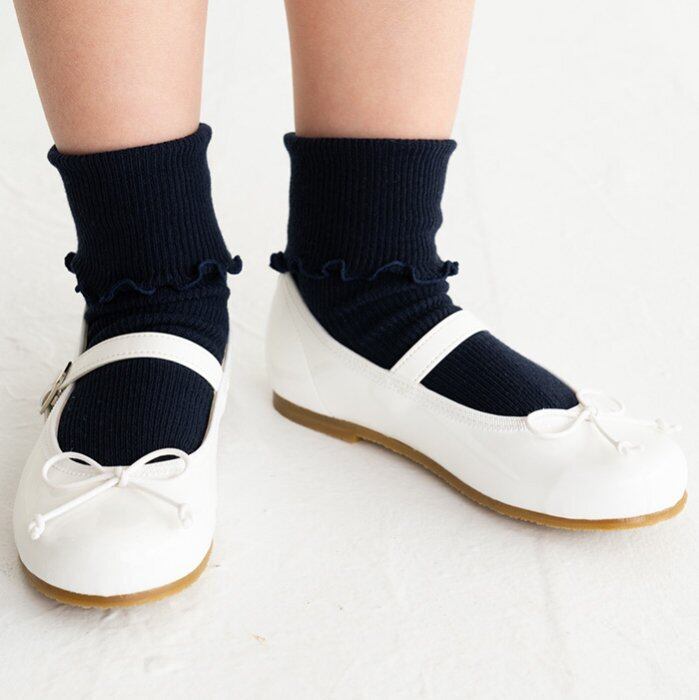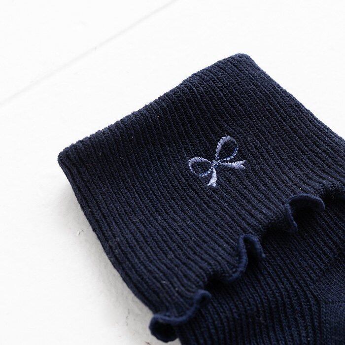サイドにリボン刺繍模様を施した、細いリブの折り返しソックス。